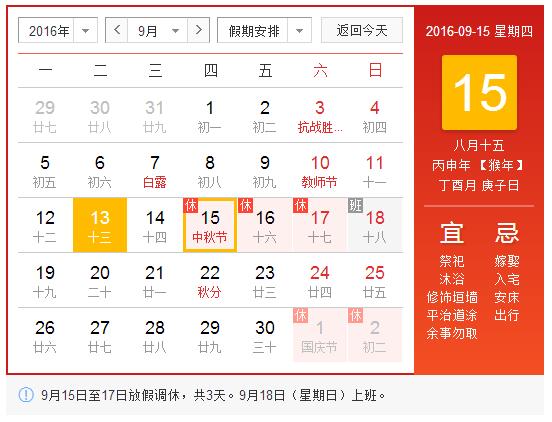 根據(jù)《國(guó)務(wù)院辦公廳關(guān)于2016年部分節(jié)假日安排的通知》精神,現(xiàn)將2016年中秋節(jié)放假日期安排通知如下: 9月15日(星期四)至9月17日(星期六)放假調(diào)休,共3天。9月18日(星期日)上班。